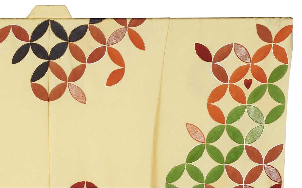 この作品のテーマは石川さゆりさんの縁です。石川さゆりさんが今まで繋いできた色んな方との縁や、ペットへの愛情を七宝柄に表しました。ベースの黄色は石川さゆりさんの最初のシングルアルバムの「かくれんぼ」のジャケット写真の衣装から使わせて頂きました。そして、真ん中にある曲線の数々は木をイメージしていて、石川さん自身を表現してみました。