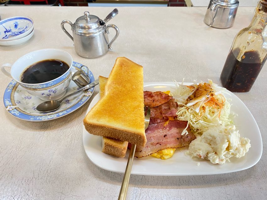出来たてほやほやのモーニングセットは、まずはやっぱり大きく分厚いトーストから。バターがシミシミでジュワッと口の中に広がります。スクランブルエッグはふわふわでトロトロ。大きなスクランブルエッグの上には、ベーコンが3枚も乗っています。シャキシャキ野菜と、じゃがいもがコロッと入ったポテトサラダは、あっさりで大きな一口で食べてしまいました。
